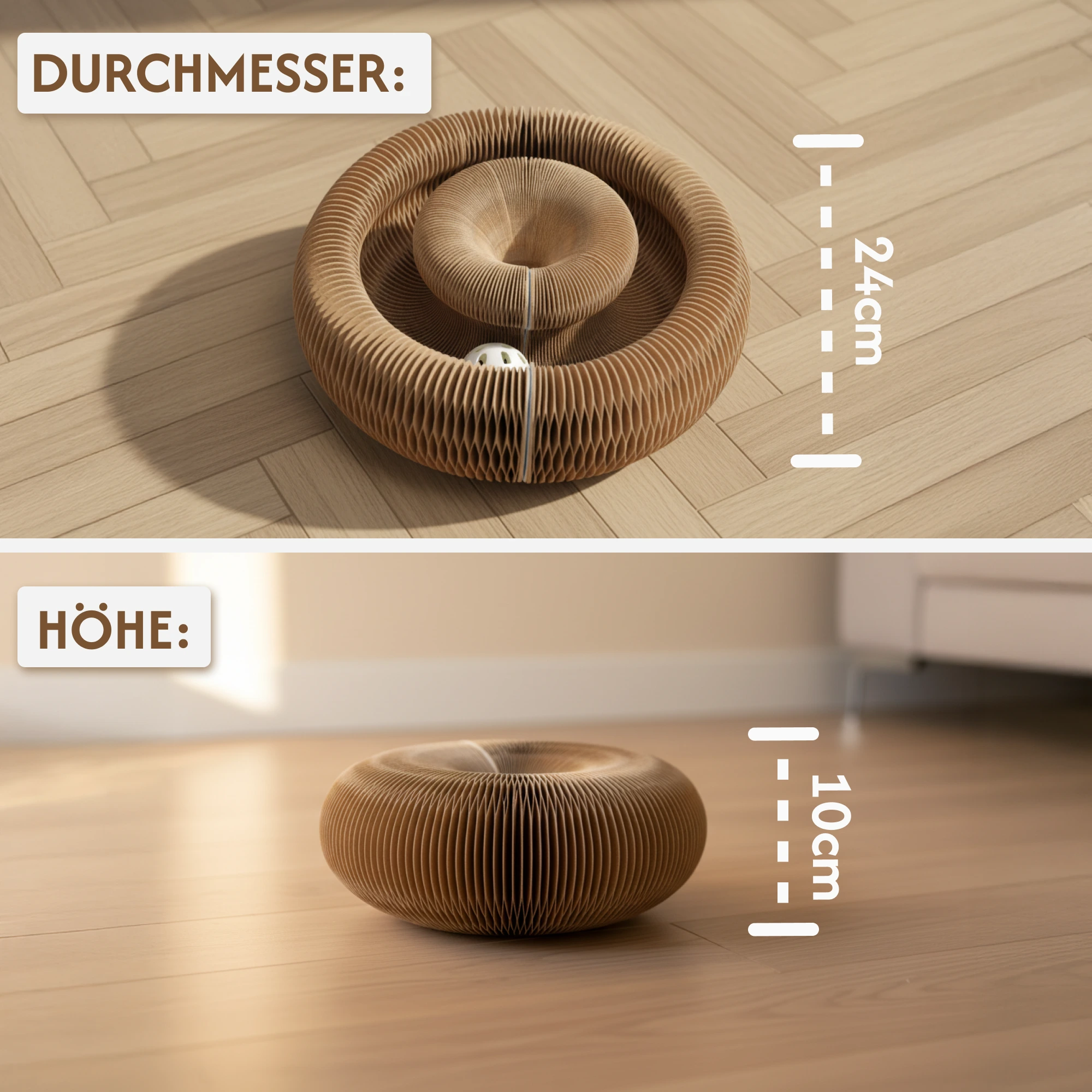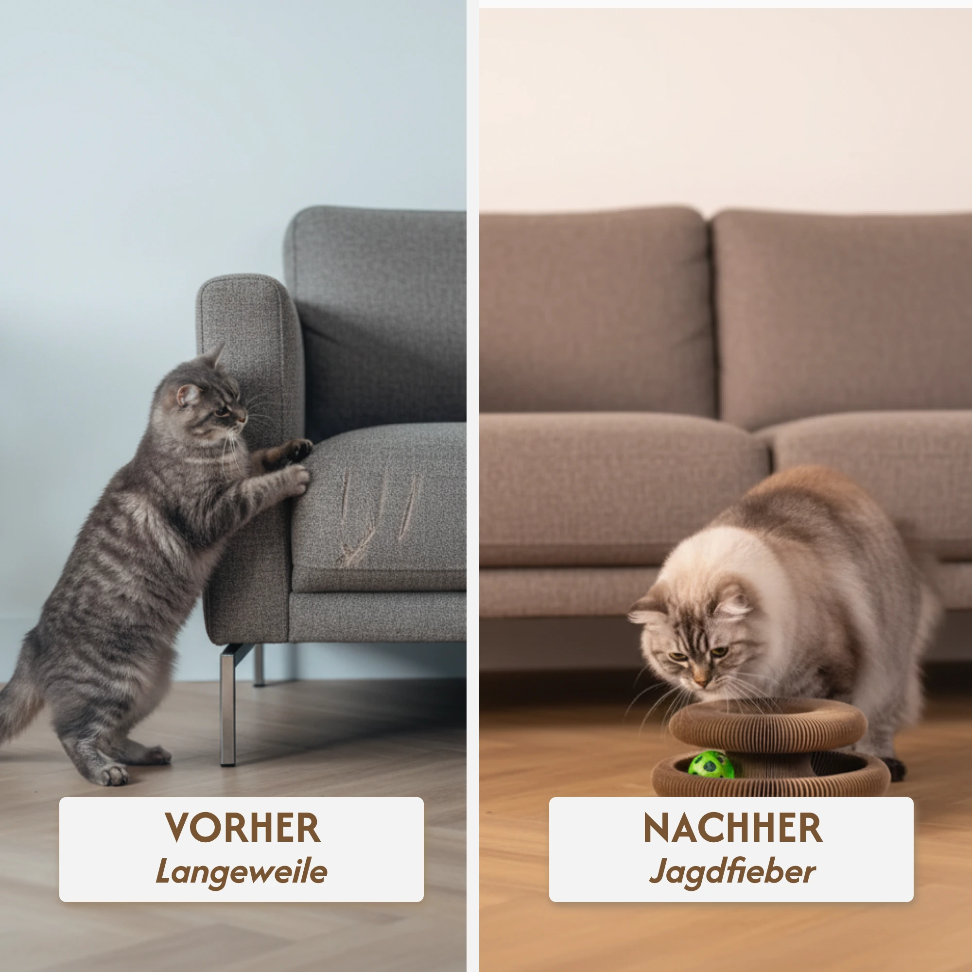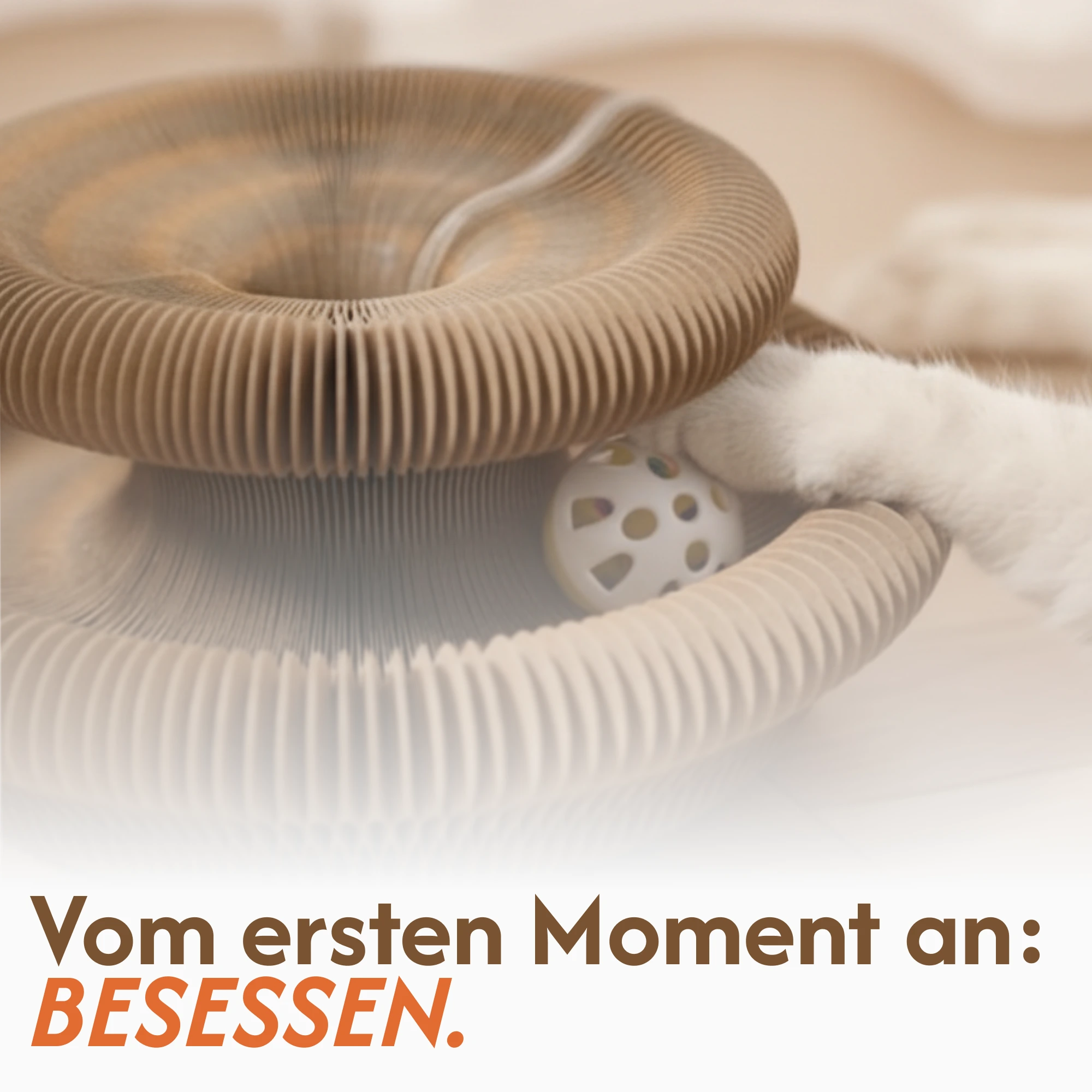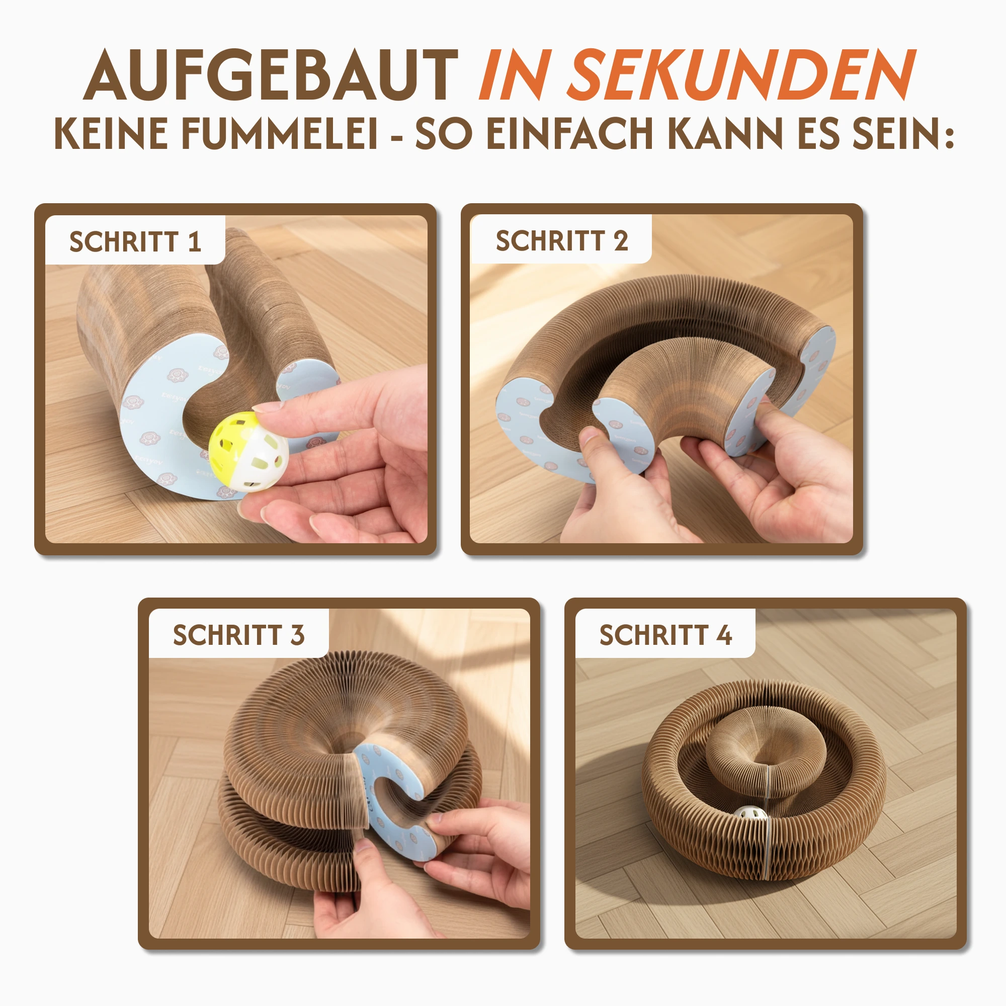 Katzen warten nicht gern. Gut, dass FellStern™ ohne Fummelei auskommt. Einfach auseinanderziehen, Ball in die Mitte, zusammenklappen – fertig. Keine Schrauben, kein Werkzeug, keine Anleitung nötig. In unter 30 Sekunden steht der Jagd-Parcours. Das Ergebnis? Ihre Katze spielt sofort, Sie haben Ruhe.
