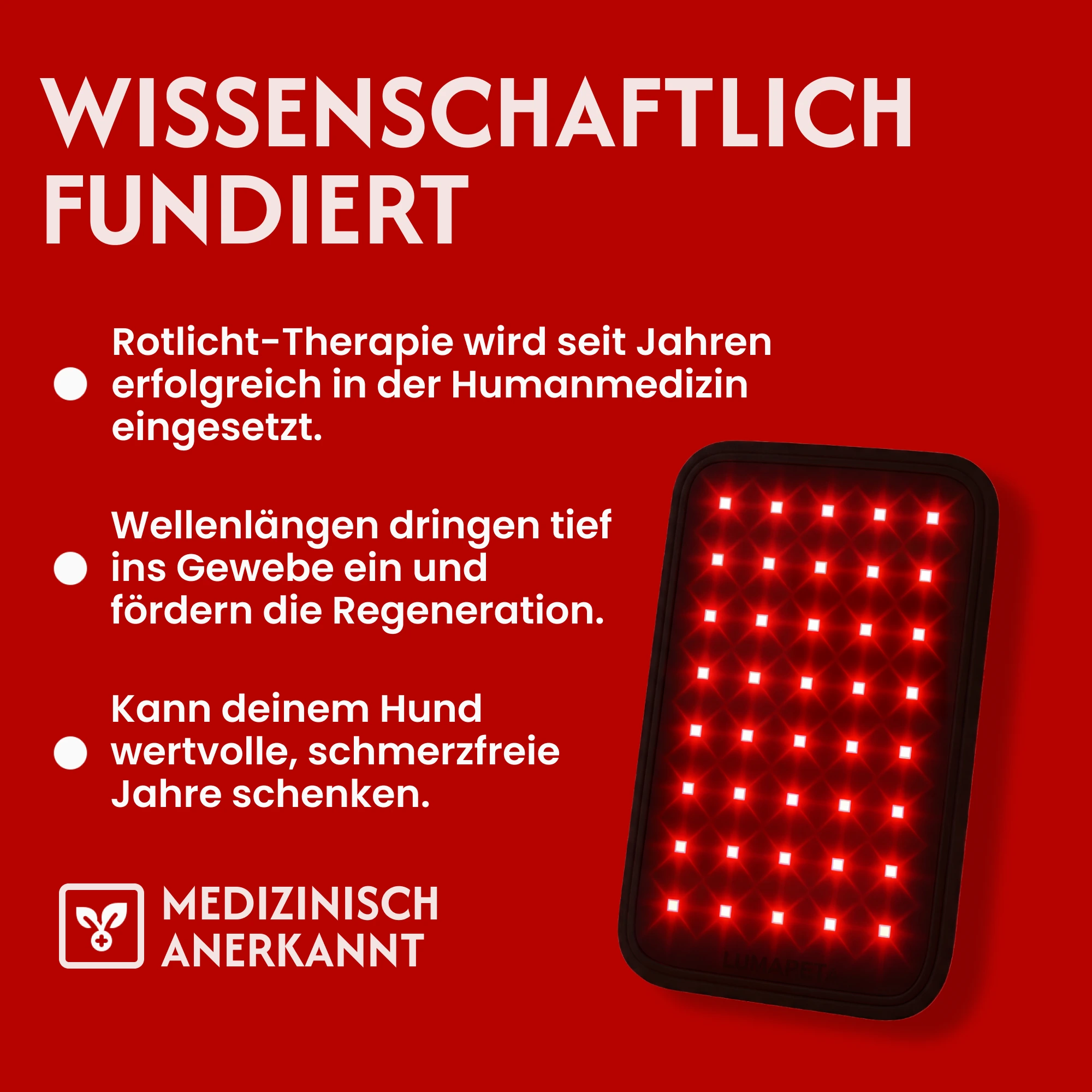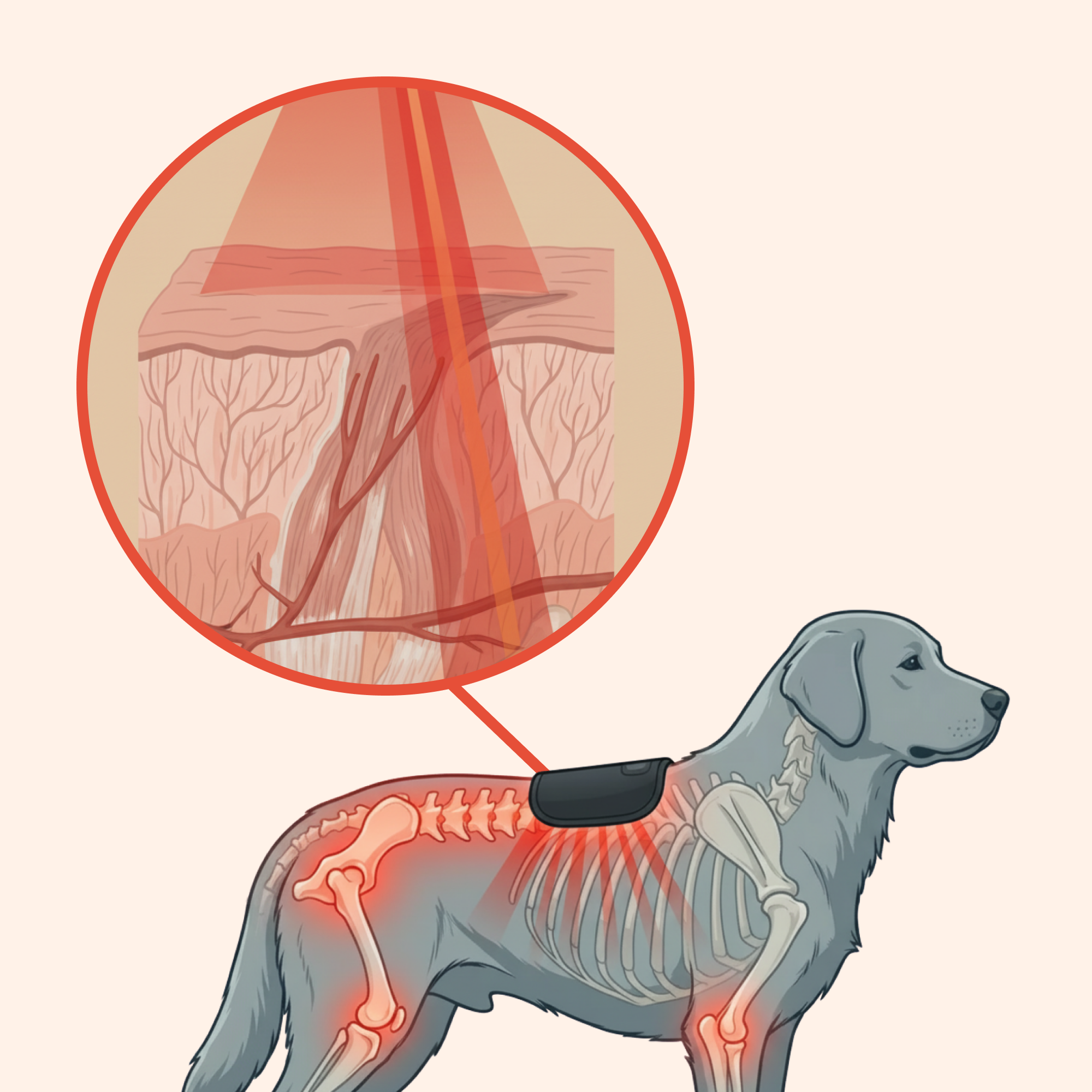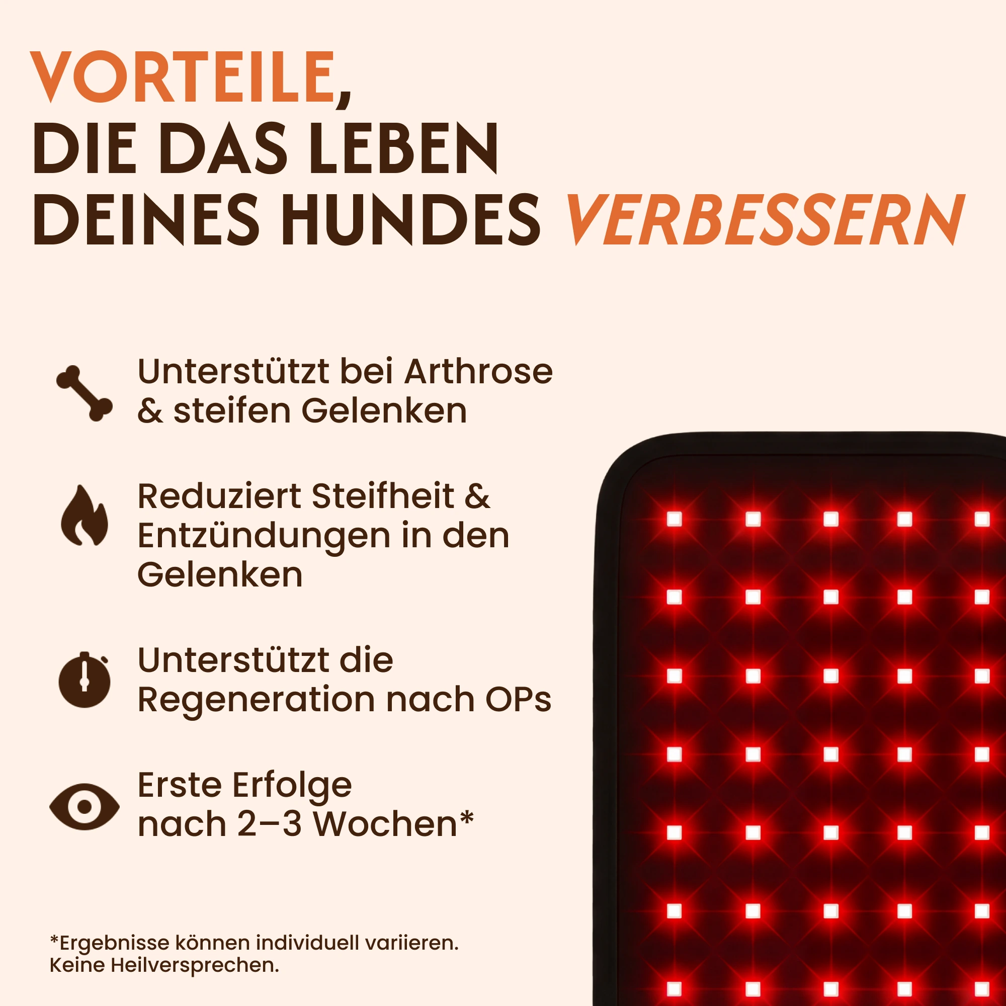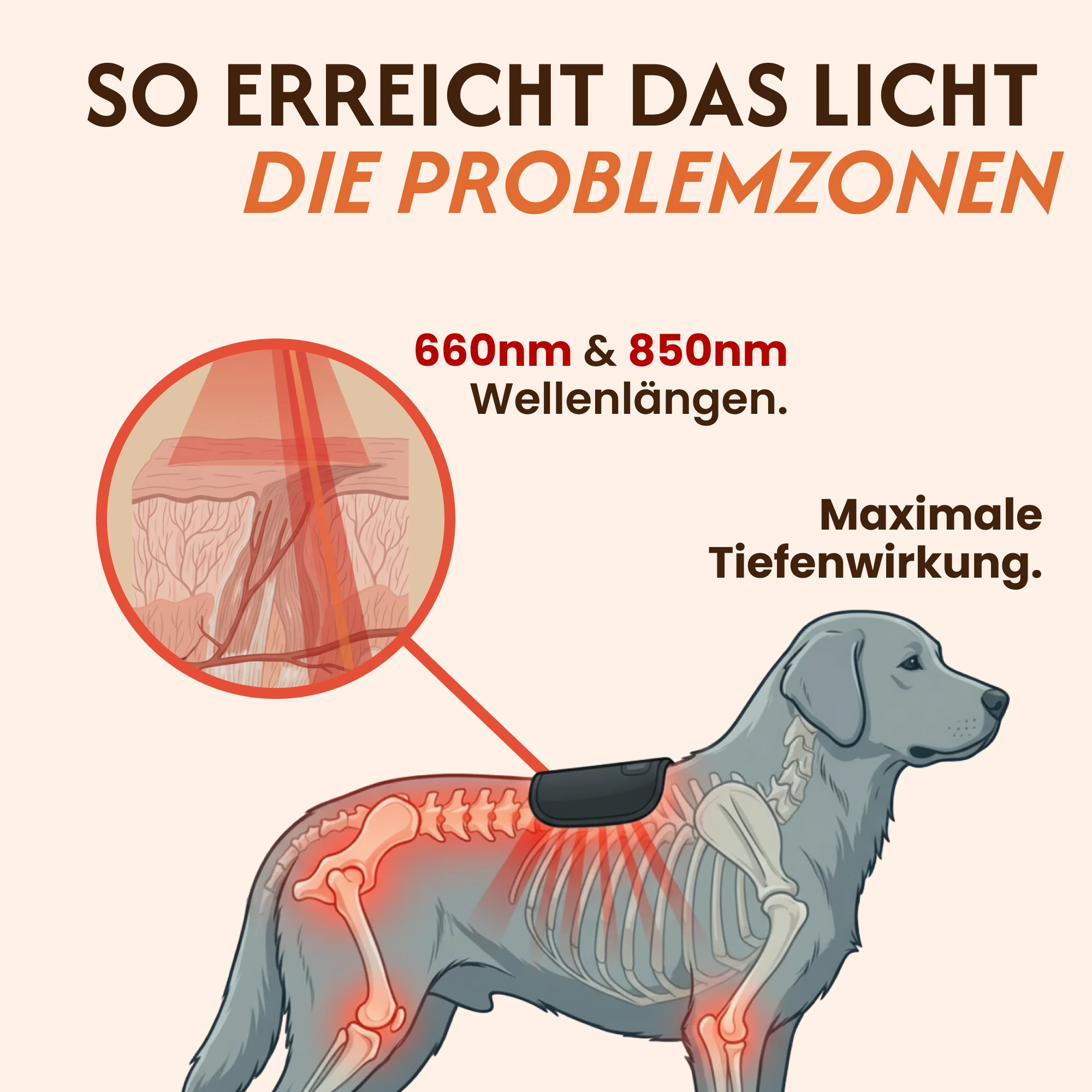 Das Rotlicht gibt den Zellen deines Hundes Energie, indem es die Mitochondrien aktiviert – die "Kraftwerke" der Zellen. Das unterstützt Regeneration, Durchblutung und kann Steifheit lindern.