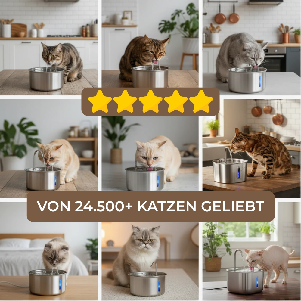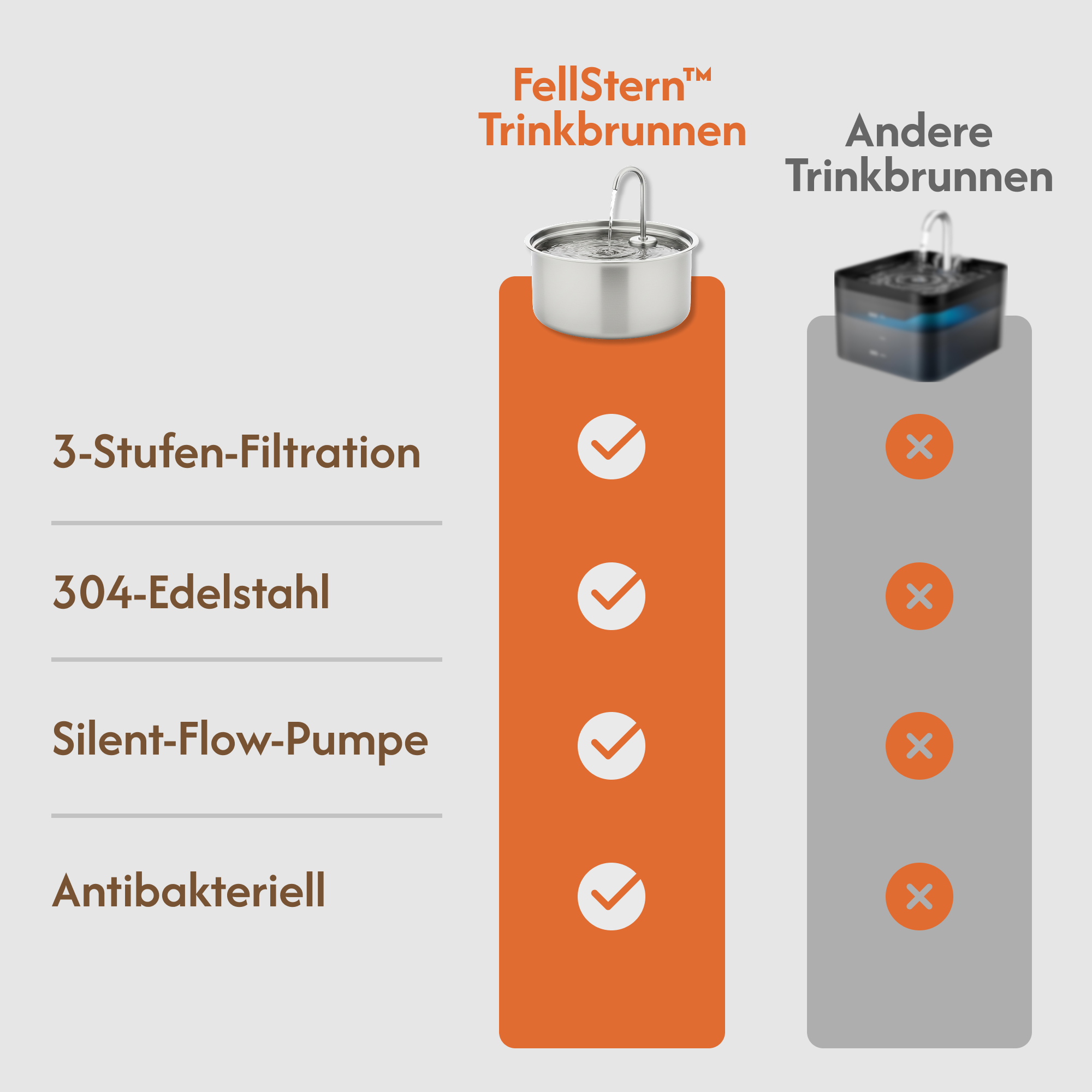 Billige Plastikbrunnen schimmeln und haben laute Pumpen. Der FellStern besteht aus antibakteriellem Edelstahl und hat eine flüsterleise Silent-Flow-Pumpe.