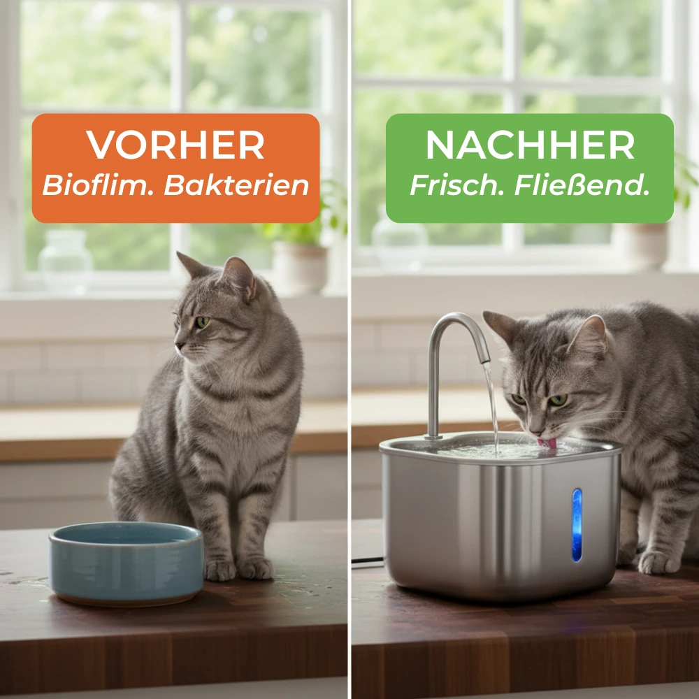 In jedem stehenden Wasser bildet sich Biofilm innerhalb von 6 bis 12 Stunden. Deine Katze riecht diese Kontamination und trinkt deshalb oft zu wenig.