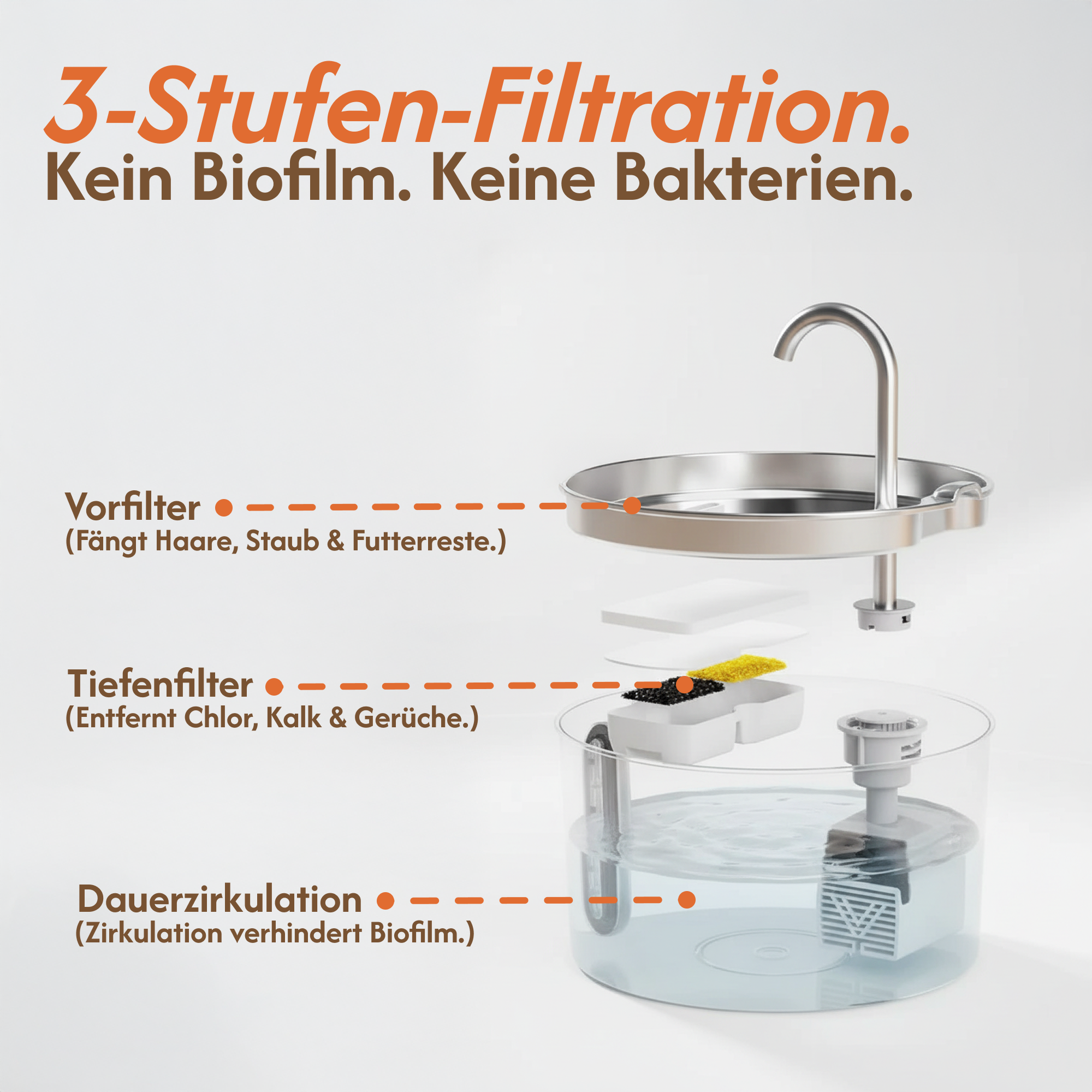 FellStern™ setzt auf Schutz auf drei Ebenen. Der Vorfilter fängt Haare, Staub und Futterreste ab. Der Tiefenfilter entfernt Chlor, Kalk und unangenehme Gerüche. Und die Dauerzirkulation verhindert, dass sich Biofilm überhaupt bilden kann. Das Ergebnis: Wasser, das dein Hund liebt und das ihm guttut.